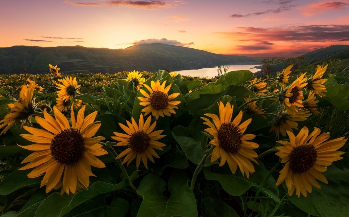 Обои подсолнухи, закат, поле, горы, озеро, скачать обои, фото и картинки бесплатно