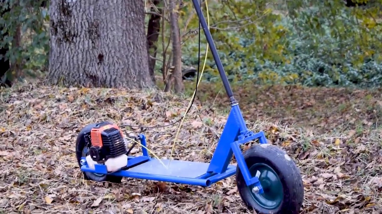 Как сделать самокат с мотором от бензокосы Приветствую всех любителей помастерить, предлагаю к рассмотрению инструкцию по изготовлению простого самоката с мотором от бензокосы. В самоделке не использовался редуктор, тут вместо него цена передача, на ведущем колесе установлена звездочка большого диаметра для снижения оборотов. Также для