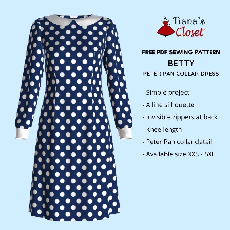 Free PDF sewing pattern: Betty peter pan collar dress The Betty Peter Pan collar dress features classic A line silhouette, with elegant long sleeve and contrast collar and cuffs. The A line silhouette is unbeatable in flattering every body shape – no matter if you are top heavy or bottom curvy. Falling just at your knee, it is a safe choice whenever it comes to choosing a modest outfit for semi formal or formal events. The best thing about it is that it is quite a simple ...