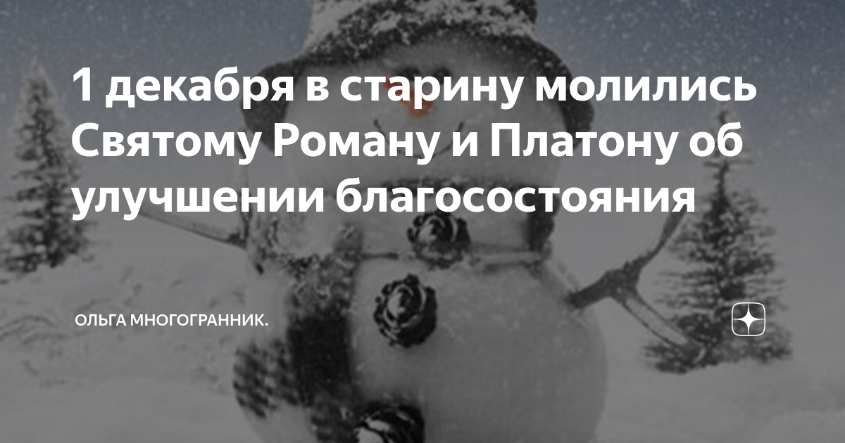 1 декабря в старину молились Святому Роману и Платону об улучшении благосостояния Наши предки 1 декабря молились Святым Платону и Роману об улучшении материального благосостояния, также святых просили помочь пережить зиму. Святые мученики Роман и Платон пострадали за веру. Оба мужчины были замучены до смерти. С 1 декабря на Руси начинается календарная зима. Согласно старинным поверьям этот день показывает какая будет наступившая зима. Даже есть старинная поговорка: "Пла...