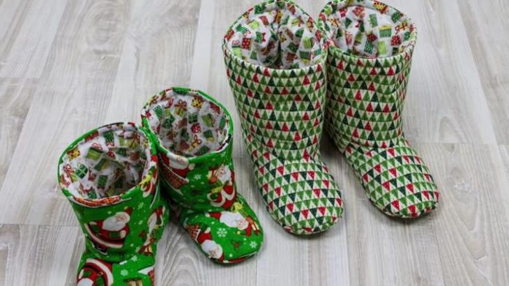 Тёплые тапочки-сапожки своими руками Такие домашние тапочки-сапожки согреют в холодное время года и просто поднимут настроение! Подберите красивую праздничную ткань, и тогда такие сапожки станут прекрасным подарком к Новому году! Для вык...