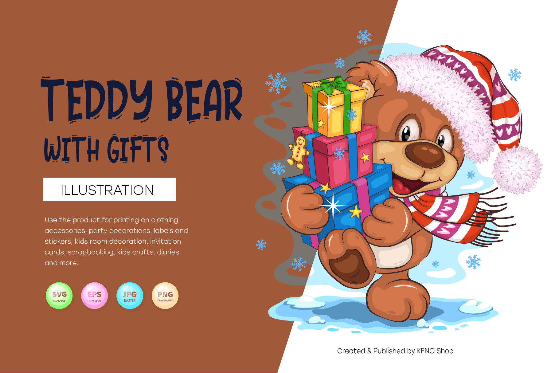 Cartoon Teddy Bear with Gifts. T-Shirt, PNG, SVG. Christmas illustration of cartoon teddy bear with gifts. Unique design, Children's illustration. Use the product for printing on clothing, accessories, party decorations, labels and stickers, kids room decoration, invitation cards, scrapbooking, kids crafts, diaries and more. ------------------------------------------- EPS_10, SVG, JPG, PNG file transparent with a resolution of 300 dpi, 15000 X 15000.