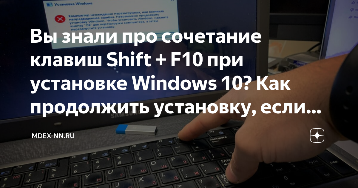 Вы знали про сочетание клавиш Shift + F10 при установке Windows 10? Как продолжить установку, если система выдаёт ошибку Компьютер неожиданно перезагрузился, или возникла непредвиденная ошибка. Невозможно продолжить установку Windows. Чтобы установить Windows, нажмите кнопку "ОК" для перезагрузки компьютера, а затем перезапустите установку. Подобное сообщение может появляться когда вы делаете чистую установку или обновляете Windows до новой версии. И хотя в заголовке знач...
