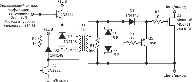Трансформатор управления затвором обеспечивает быстрое выключение MOSFET. Показанная на Рисунке 1 конструкция позволяет сигналу, управляющему MOSFET, иметь коэффициент заполнения от 50% до 0%, обеспечивая при этом высокую скорость выключения, недостижимую с помощью простого нагрузочного резистора.