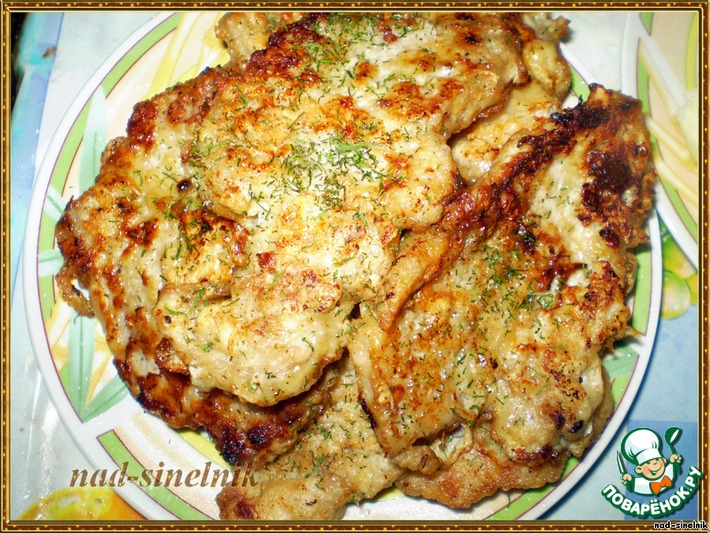 - Мясо разрезать на отбивные, лучше 8 маленьких кусков, чем 4 больших, отбить. На тарелке смешать соль, сахар, перец. Влажной рукой набрать этой смеси немного (сколько прицепится), так вы их не пересолите. И дотронуться к отбивной, смесь прилипнет. Так с двух сторон. Ничего, если немного неравномерно. Отбивные залить молоком и оставить хотя бы на час, можно на дольше. За это время их пару раз перемешать. Отбивные набухнут, вберут молоко и станут очень нежными. Вилкой перемешать яйцо, щепотку соли и перца. На другую тарелочку насыпать муки. Обвалять отбивную в муке. Потом в яйце. Жарить в подсолнечном масле до готовности. Готовые отбивные посыпать зеленью. У меня сушеный укроп.