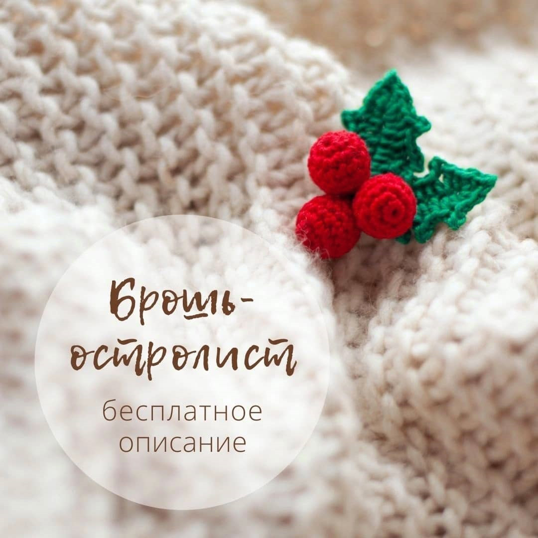 PDF Брошь Остролист крючком. FREE crochet pattern; Аmigurumi toy patterns. Амигуруми схемы и описания на русском. Вязаные игрушки и поделки своими руками #amimore - маленькая брошь в виде листьев падуба с ягодами, брошка в виде листьев остролиста к Новому году.