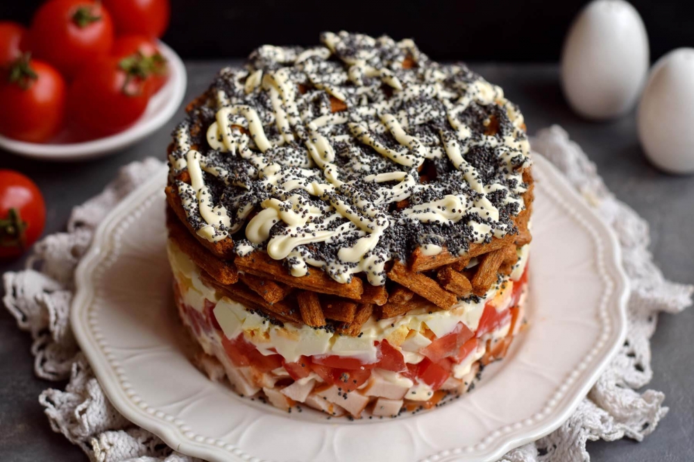 Салат Курица под кайфом Вкусный салат с интересным названием Курица под кайфом. Его можно готовить, как в порционных пиалочках, так и на общей тарелочке. Это слоеный салат из небольшого количества продуктов. Основной вкус салату придает копченое мясо, лучше использовать именно копченые куриные окорока, они более мягкие и сочные, нежели филе. Изюминка салат – это присыпка из мака, она отлично вписывается в ингредиентный состав, делая салат оригинальным и особенным.