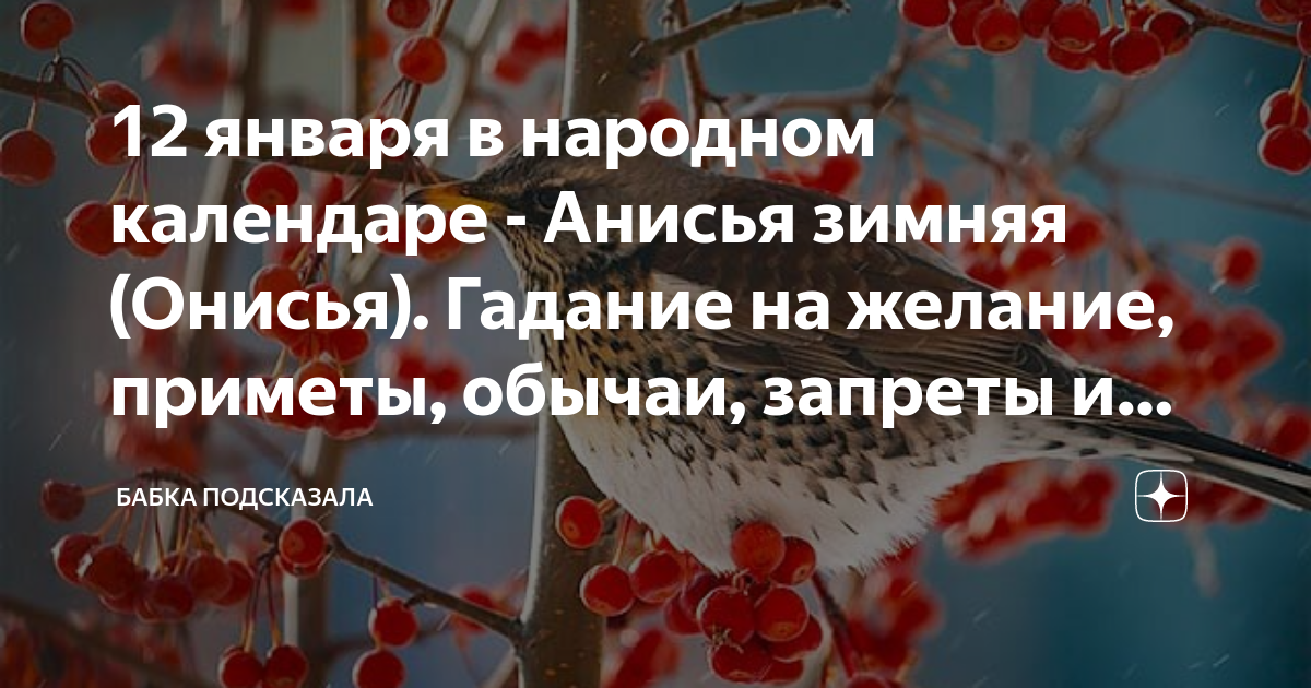 12 января в народном календаре - Анисья зимняя (Онисья). Гадание на желание, приметы, обычаи, запреты и поверья дня Какой праздник отмечается 12 января в народном календаре. Анисья зимняя, Онисья. Народные приметы и поверья 12 января. По народной традиции, в день Анисьи хозяюшки начинали готовить различные блюда из свинины к предстоящему Васильеву вечеру (13 января). А 14 января отмечали Васильев день (Старый Новый год). Также обязательно на праздничном столе должен был бы...