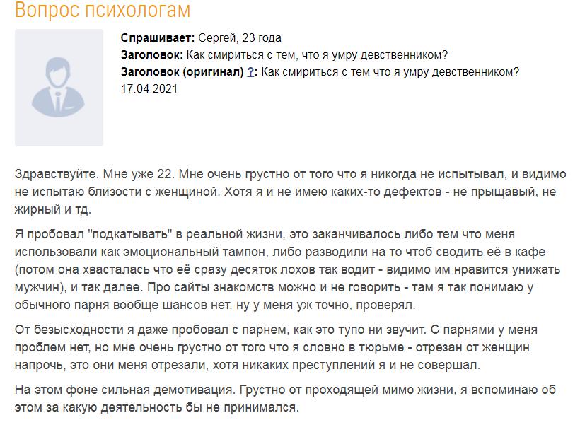 Как смириться с тем, что я умру девственником? На психологический форум поступил вопрос: Мой ответ: Здравствуйте. Секундочку, секундочку… подождите… Вот тут: Цитата клиента: Я пробовал «подкатывать» в реальной жизни, это заканчивалось либо тем что меня использовали как эмоциональный тампон, либо разводили на то чтоб сводить её в кафе (потом она хвасталась что её сразу десяток лохов так водит — видимо им нравится унижать […] Читай дальше на сайте. Жми подробнее ➡