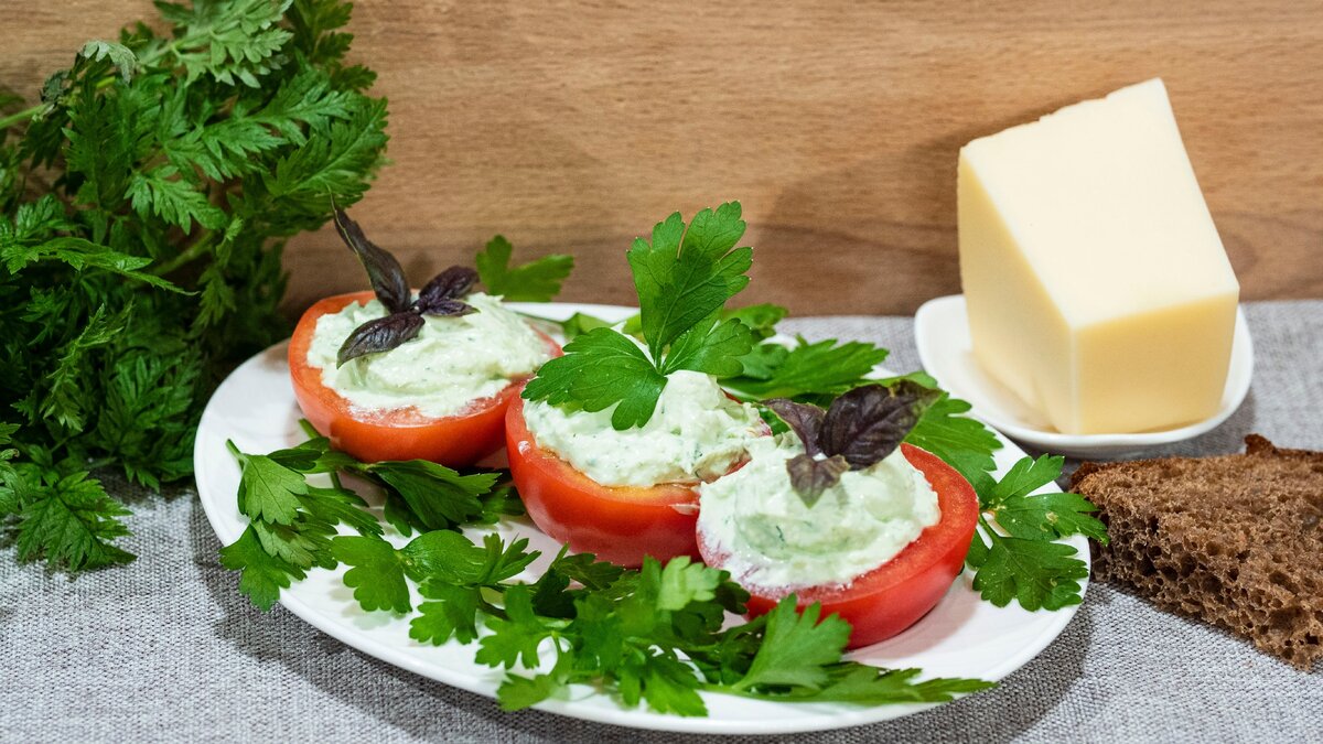 Красиво, вкусно, полезно – помидоры, фаршированные нежным творогом, ароматной зеленью, сыром и пикантным чесноком!