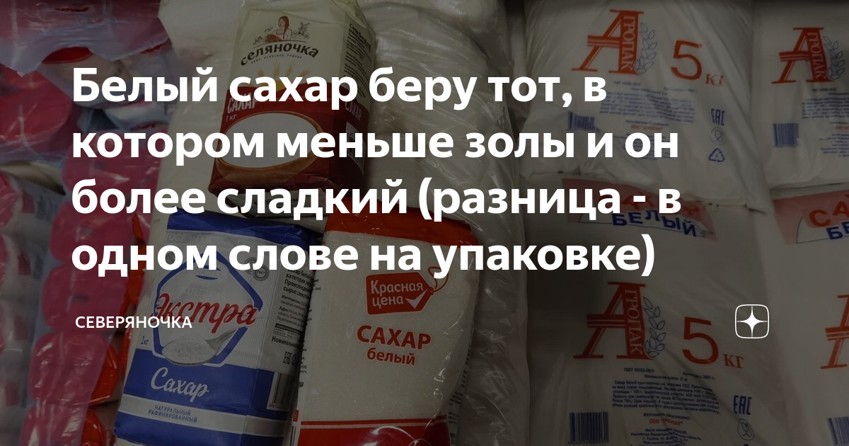 Белый сахар беру тот, в котором меньше золы и он более сладкий (разница - в одном слове на упаковке) Если вы думаете, что в пачке сахара - только сахар, то ошибаетесь. В нем легко могут оказаться подсластители (зачем? а вот!), антислеживающие агенты (они не дают сахару комковаться), зола и даже механические примеси. И все это считается вполне нормальными добавками. Белый (рафинированный) сахар для чая и кофе я покупаю нечасто. Чаевничаем мы вообще без сахара, а если и доба...