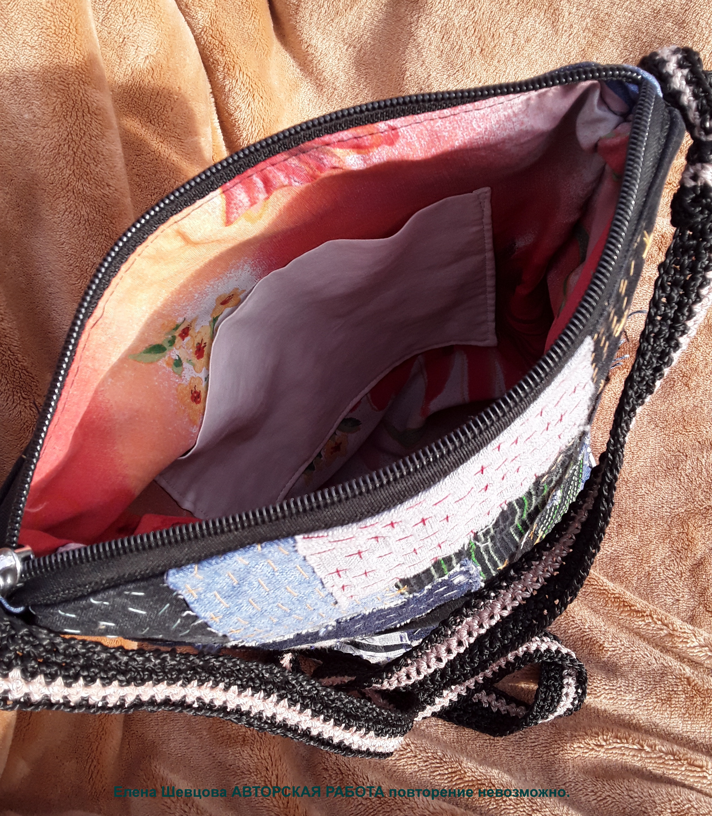Сумочка на молнии, на подкладке и с одним кармашком внутри.