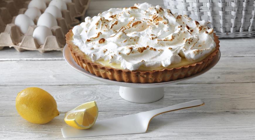 - Наполните тарт лимонным кремом, на крем выложите меренгу. Через ситечко посыпьте меренгу небольшим количеством сахарной пудры и поставьте в духовку с разогретым грилем на 10–12 мин., пока на меренге не появятся красивые светло-коричневые подпалины.