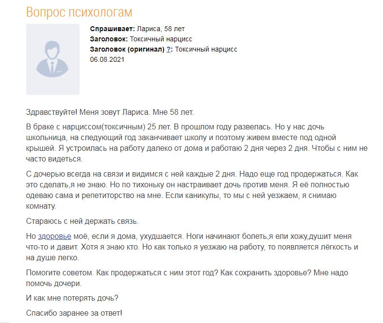https://www.all-psy.com/konsultacii/otvet/358256/ https://www.all-psy.com/konsultacii/otvet/358256/ Мой ответ. (Отвечает психолог Дмитрий Буренков) Здравствуйте. Тут: Цитата клиента: В браке с нарциссом(токсичным) 25 лет. В прошлом году развелась. Но у нас дочь школьница, на следующий год заканчивает школу и поэтому живем вместе под одной...