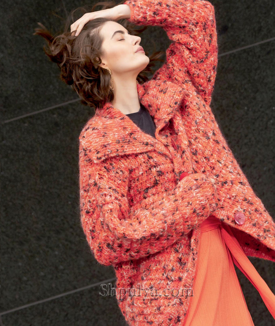 Яркий жакет с карманами и отложным воротником связан спицами из пушистой пряжи секционного крашения с добавлением мохера.