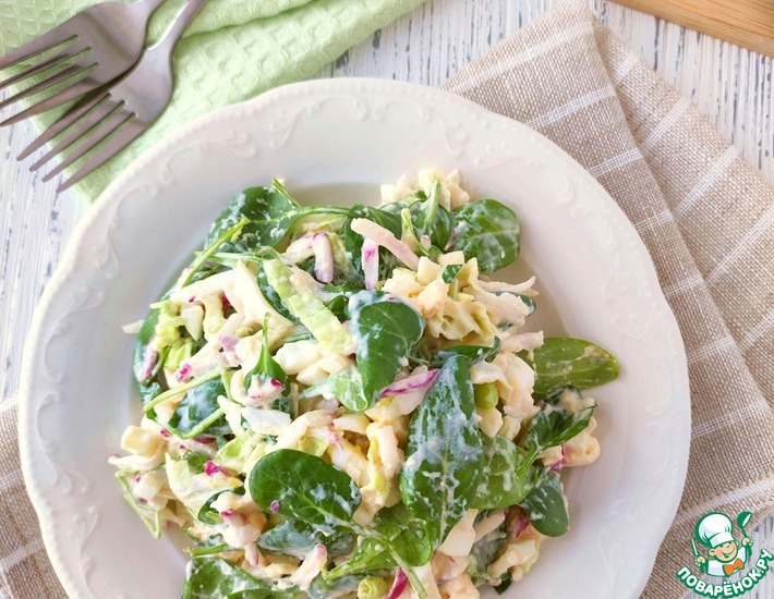 - Редис (5 шт.) нашинковать на терке для приготовления моркови по-корейски. Яйца (3 шт.) отварить, затем нашинковать соломкой/кубиками. Пекинскую капусту (верхнюю часть листьев) нарезать ленточками/полосками. Жесткие основания капусты пожно измельчить в блендере и ипользовать как добавку в мясной фарш при приготовлении котлет. Зеленый лук нашинковать мелкими кубиками. В миску добавить все составляющие салата, далее добавить листья шпината Салат перемешать, добавить по-вкусу соль. Заправить салат майонезом. Если вы будете использовать для заправки салата сметану, можно добавить небольшое количество готовой горчицы по-вкусу. Приятного аппетита!