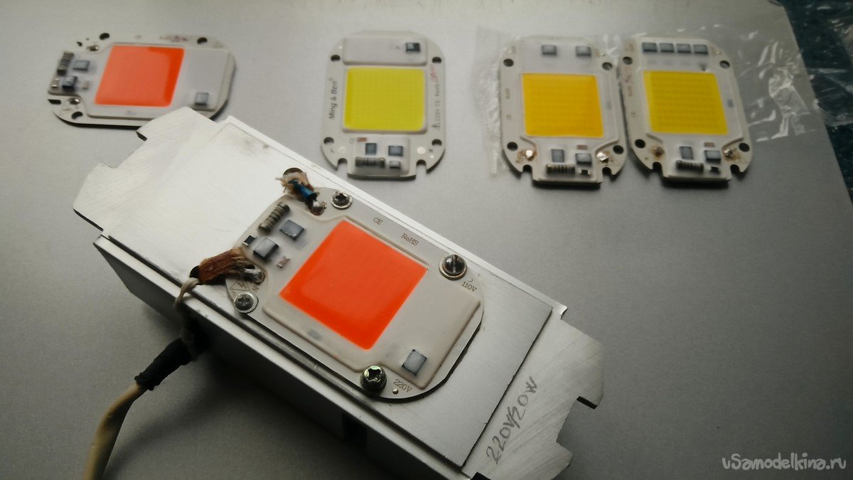 Фитопрожектор на COB светодиодной матрице Готовые светодиодные модули на алюминиевой подложке отлично подходят для самодельного изготовления фитопрожектора (фитолампа). Такой COB (Chip-On-Board) LED имеет подложку размером 60 на 40мм со светящейся поверхностью 25 на 25мм. Благодаря множеству светодиодов, залитых слоем люминофора,