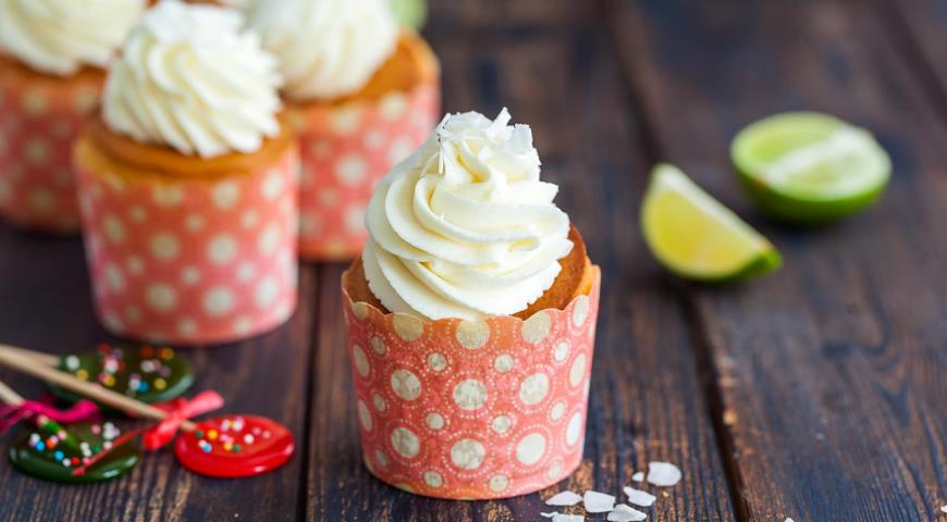 - Взбейте сливки с сахарной пудрой до жестких пиков, добавьте маскарпоне и снова взбейте. Переложите крем в кондитерский мешок и выдавите на кексы. Украсьте капкейки кокосовой стружкой и, при желании, цветной посыпкой.