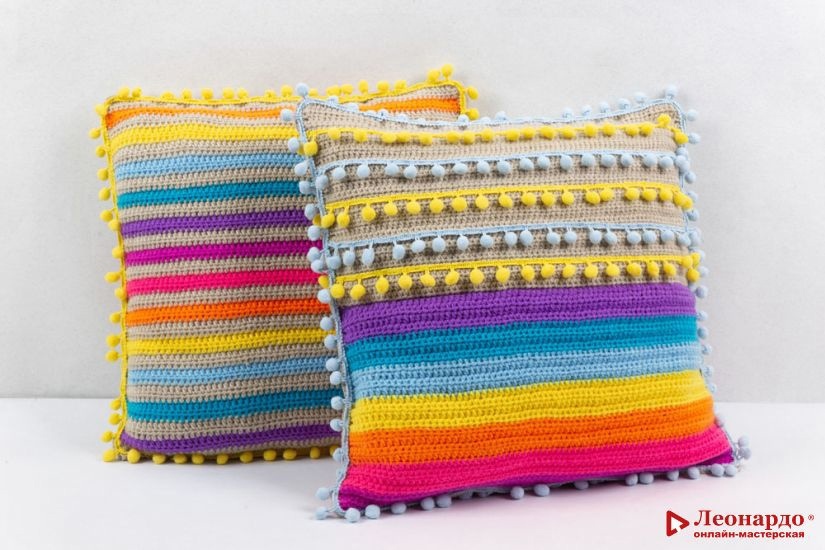 Декоративные наволочки "Полоски и помпоны" Декоративные наволочки "Полоски и помпоны"Вязаные наволочки для подушек крючком – это привлекательно и индивидуально! А ещё это отличная возможность использовать остатки разной цветной пряжи.