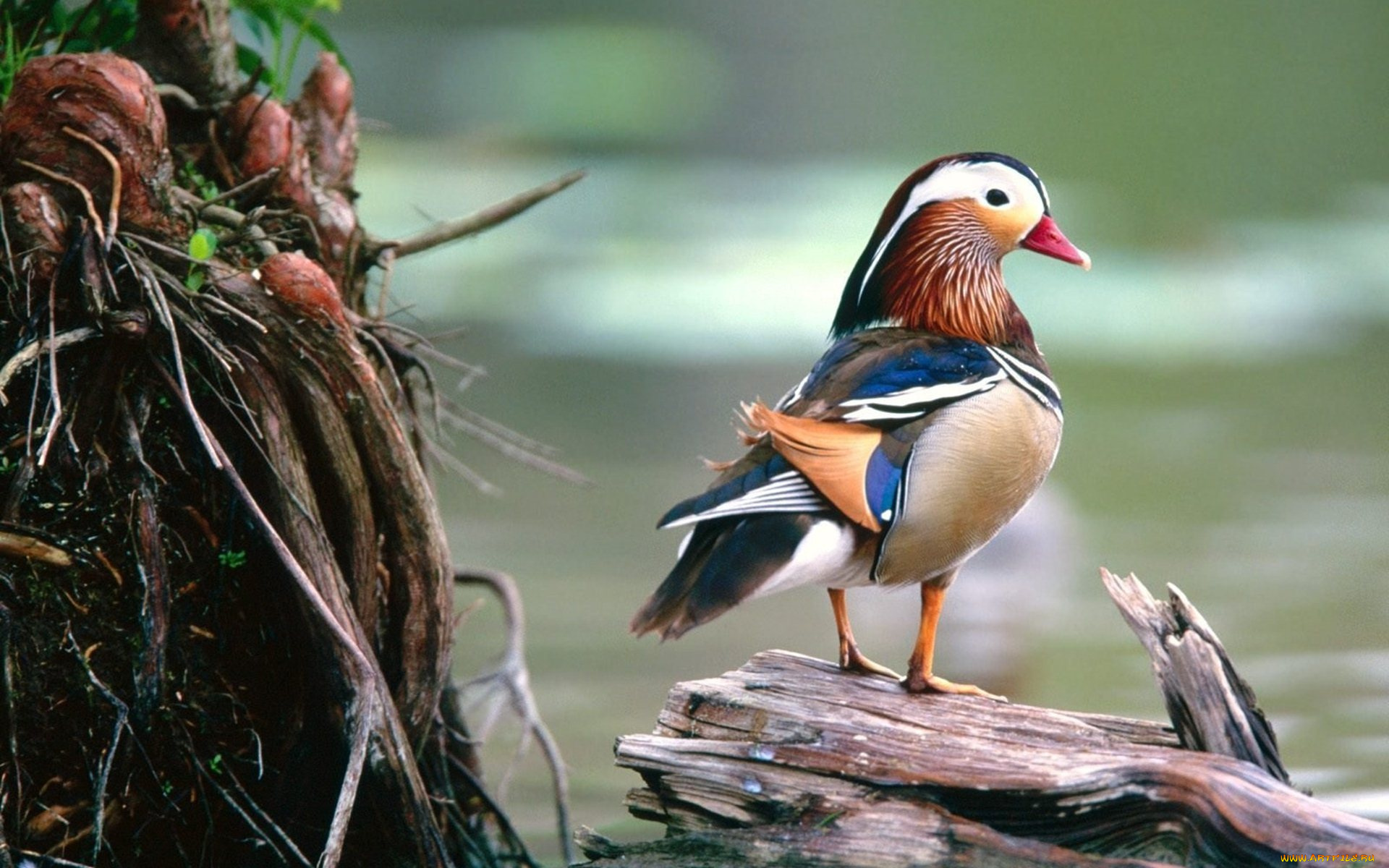 Скачать обои животные, утки, мандаринка, бревно из раздела Животные, в разрешении 1920x1200