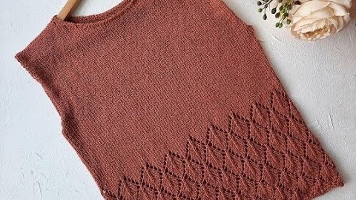 Вяжем простую летнюю майку спицами с ажурным узором.