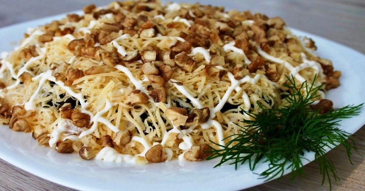 Благодаря черносливу, куриному мясу и грибам, салат получается с нежным и удивительным вкусом