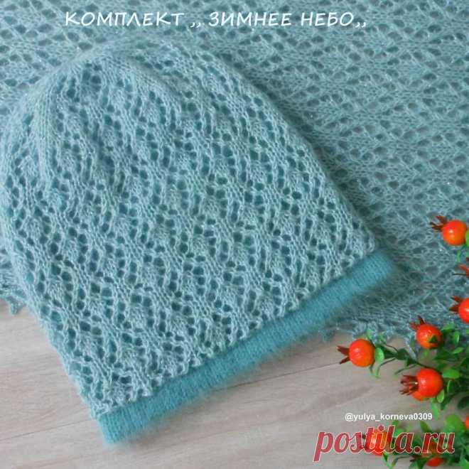 Красивый комплект "Зимнее небо" от yulya_korneva0309 Пряжа - для снуда Alize Angora Gold simli ( 114) , спицы 4,5 - для шапочки: нижняя шапочка пух норки( 50), верхняя Alize Angora Gold simli ( 114), спицы 4,0 Схема по которой вязала комплект очень популярная, чуть- чуть внесла изменения ( не делала накид внутри ромбика)
