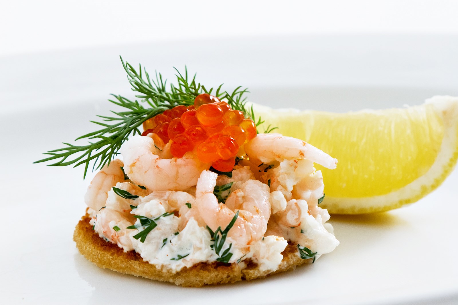 - 3 Выложить полученную смесь на обжаренные ломтики хлеба. Сверху на каждый тост положить несколько креветок и по ложечке икры. Украсить веточкой укропа и долькой лимона.