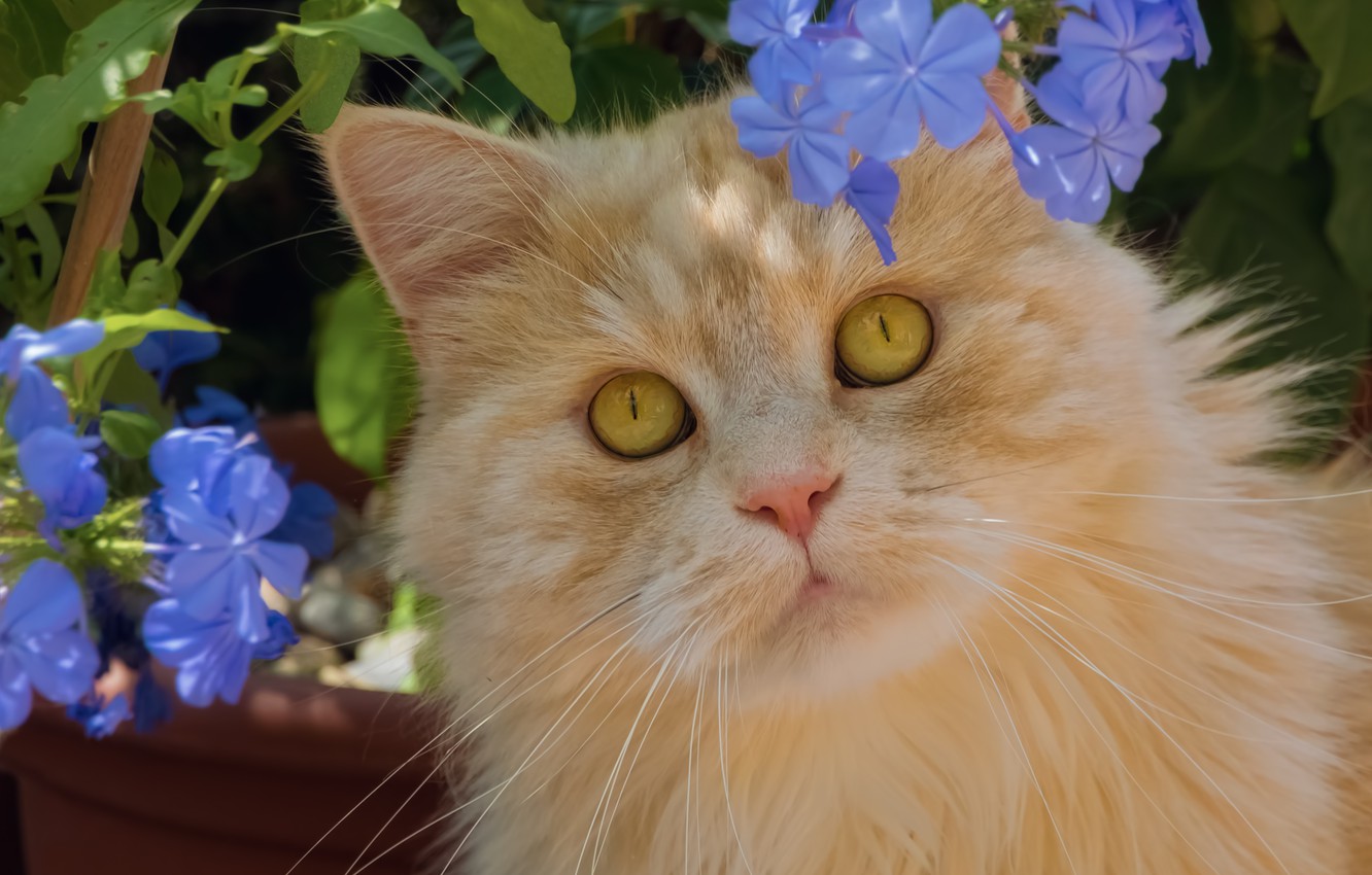 Обои кот, взгляд, цветы, портрет, рыжий картинки на рабочий стол, раздел кошки - скачать