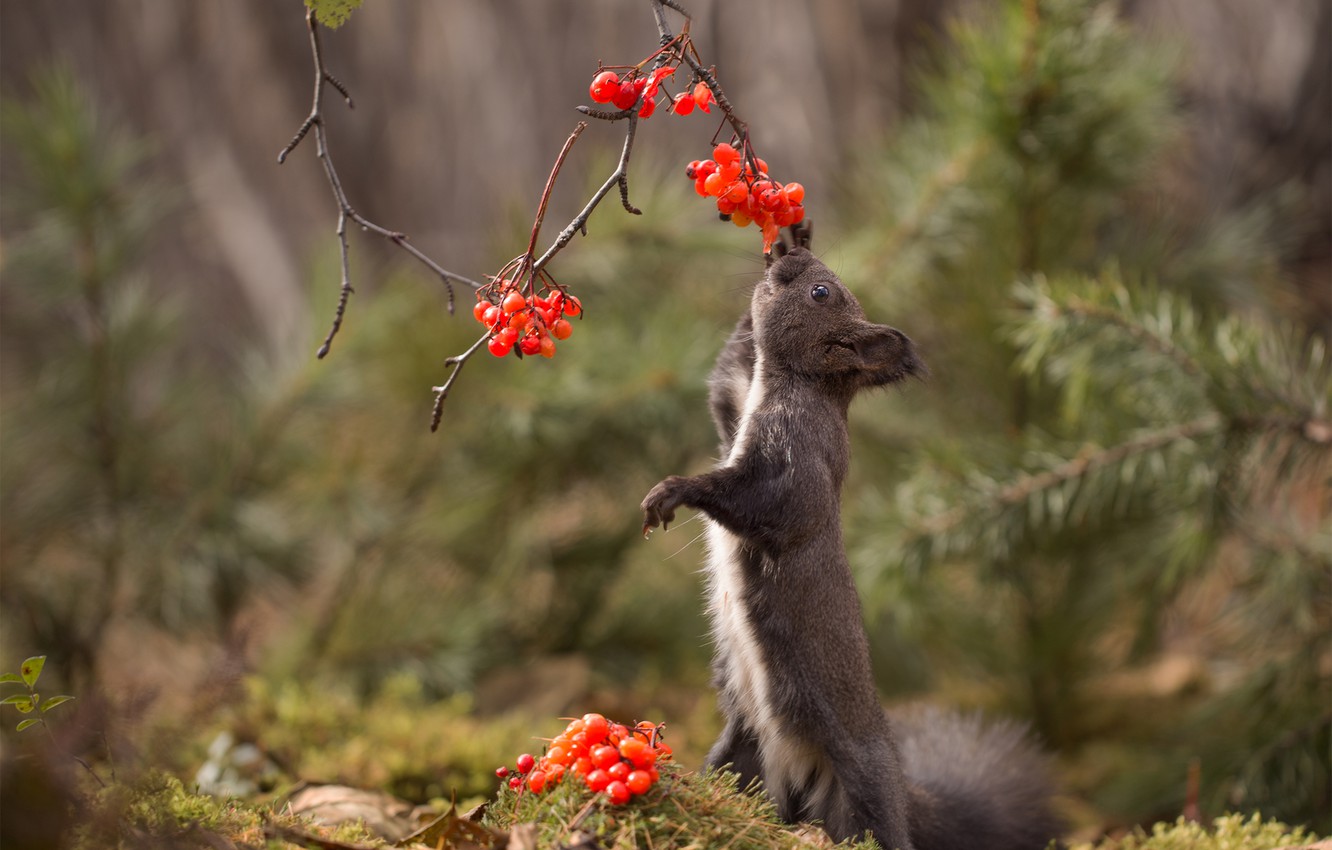 Обои лес, ветки, ягоды, белка, грызун, калина, зверюшка картинки на рабочий стол, раздел животные - скачать