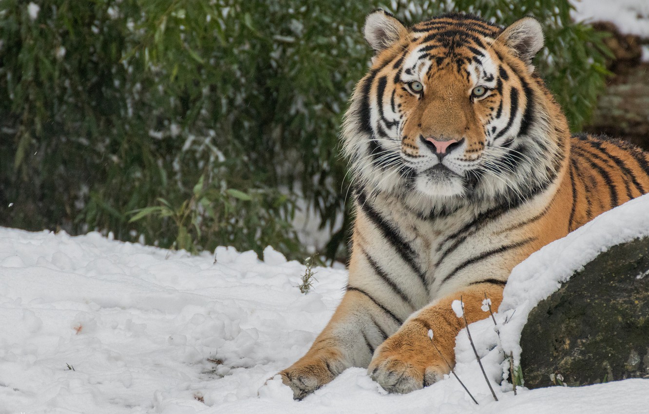 Обои зима, кошка, морда, листья, снег, природа, тигр, фон, дикие кошки картинки на рабочий стол, раздел кошки - скачать