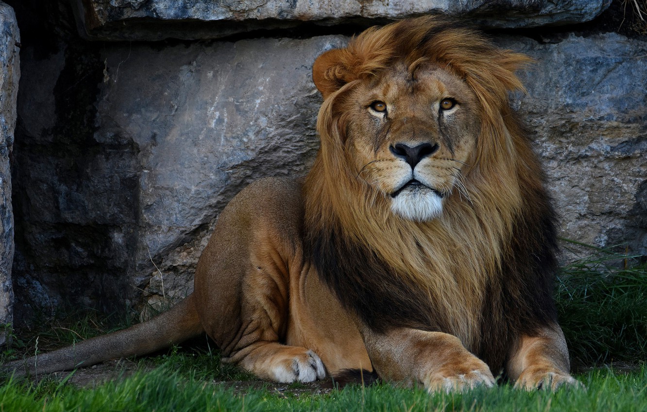 Обои трава, взгляд, морда, кошки, природа, фон, камень, портрет, лев, лапы, грива, лежит, дикие кошки, зоопарк картинки на рабочий стол, раздел кошки - скачать