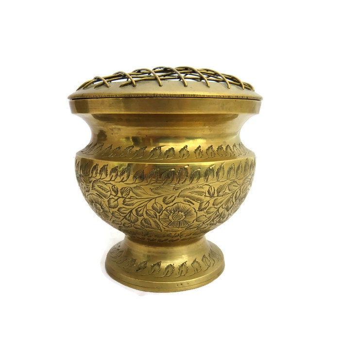 Vintage Indian Brass Bowl Wire Screen Flower Frog Lid, Flower Arranging, Flower Arrangement Vase Bowl , Etched Floral Design, India Boho VINTAGE INDIAN BRASS FLOWER FROG WITH LID AND A FLORAL ETCHED DESIGN.THIS VINTAGE INDIAN ETCHED BRASS FLOWER FROG WOULD LOOK AMAZING IN A BOHEMIAN OR ECLECTIC HOME AND WOULD MAKE A LOVELY GIFT TOO.VERY GOOD VINTAGE CONDITION,A SMALL TINY DENT AND SOME TARNISH.H 12.5 CM OR 4.8'' APPROX.RIM