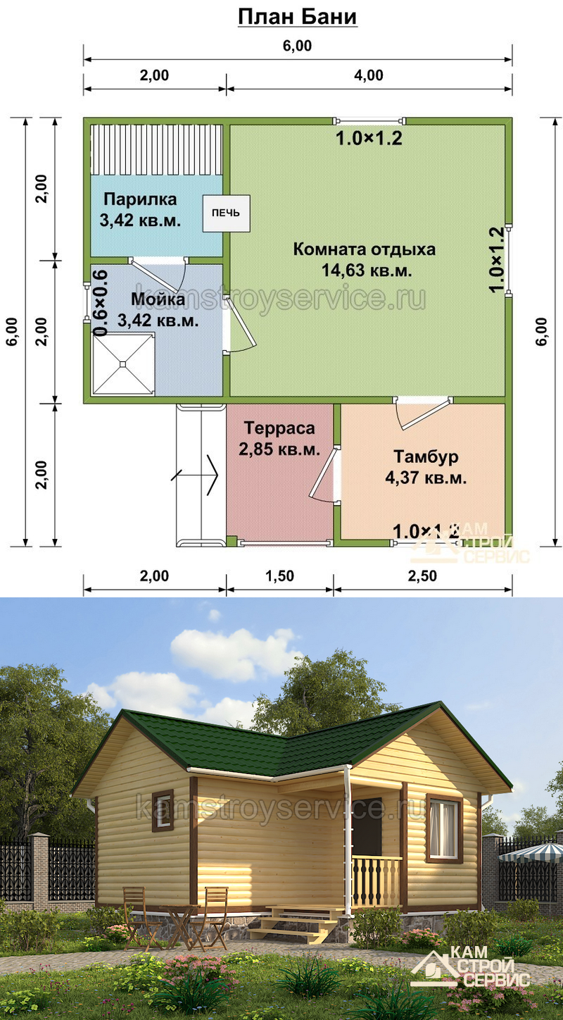 Одноэтажная баня из бруса 6х6. Проект БО-12