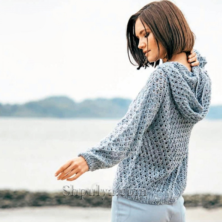 Ажурный пуловер с капюшоном связан спицами сетчатым узором из светло- голубого хлопка с шелком.