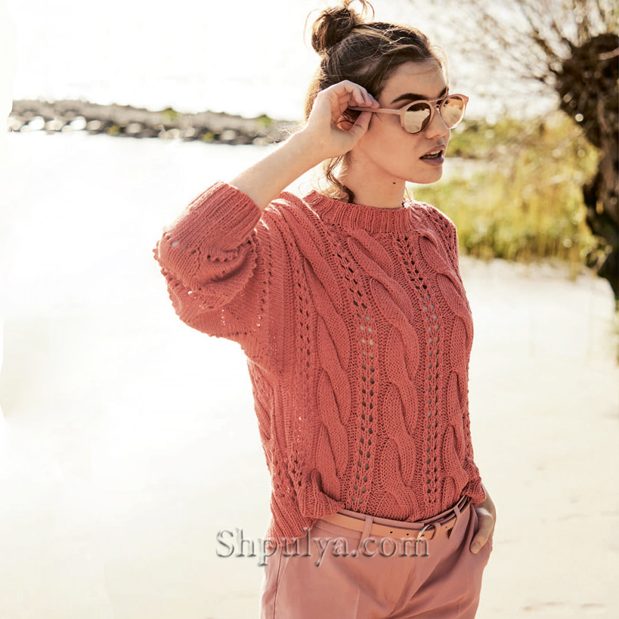 Летний короткий пуловер связан спицами узором из крупных «Кос» в окружении ажурных полос из хлопка со льном темно-кораллового цвета.