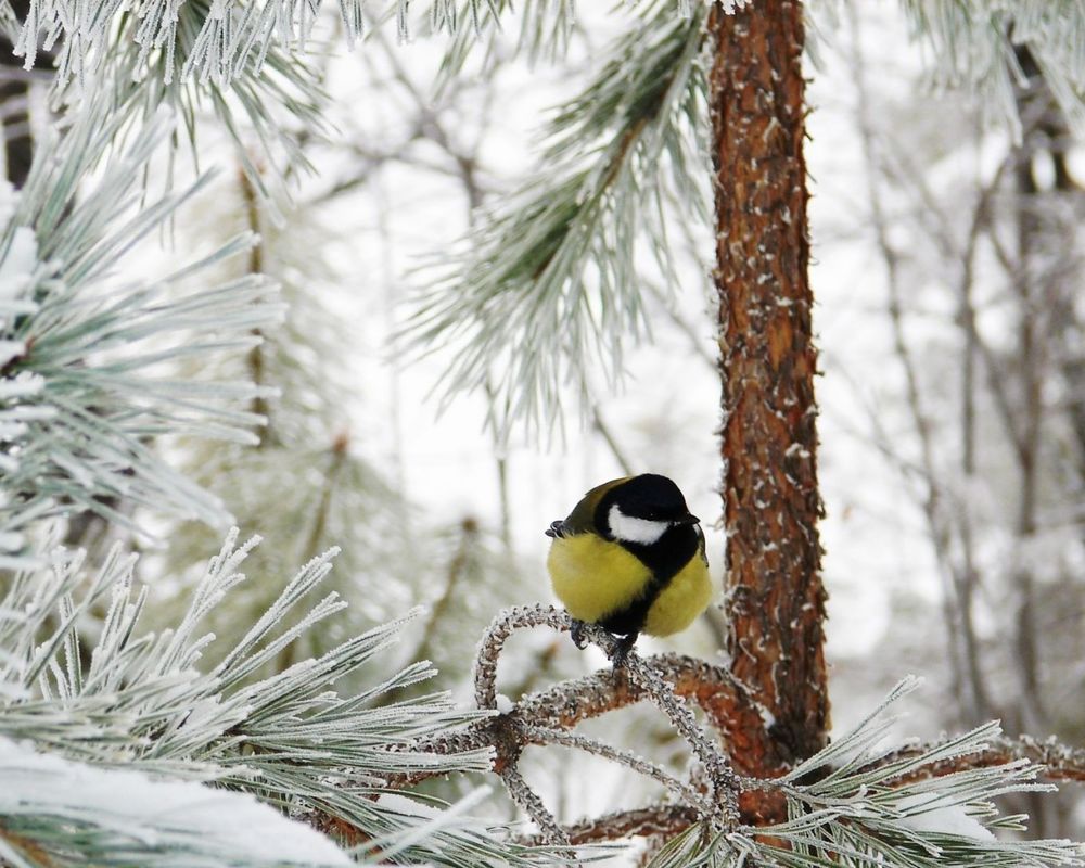 Обои Синица сидит на ветке в зимнем лесу... на рабочий стол, страница