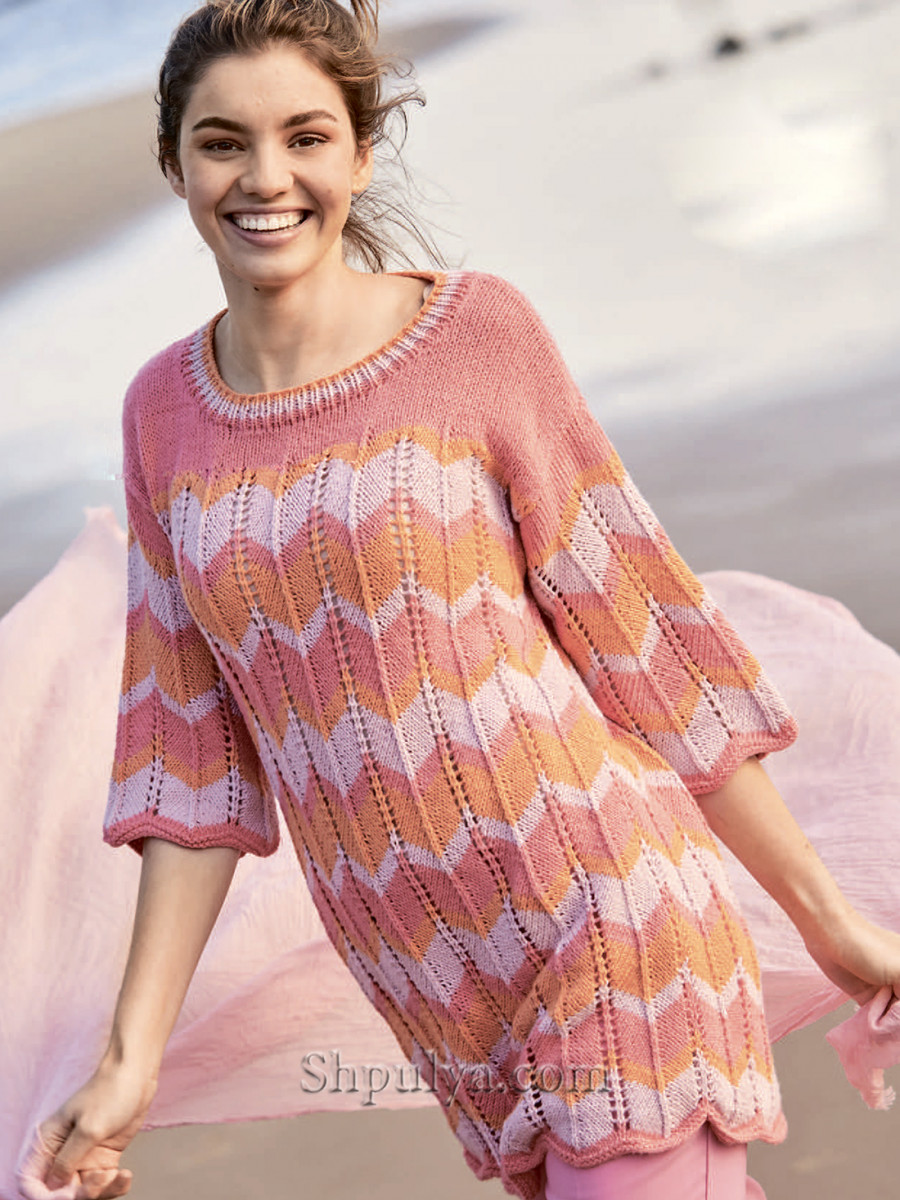 Яркая разноцветная туника связана спицами зубчатым узором из 100% хлопка в коралловых, оранжевых и розовых цветах.