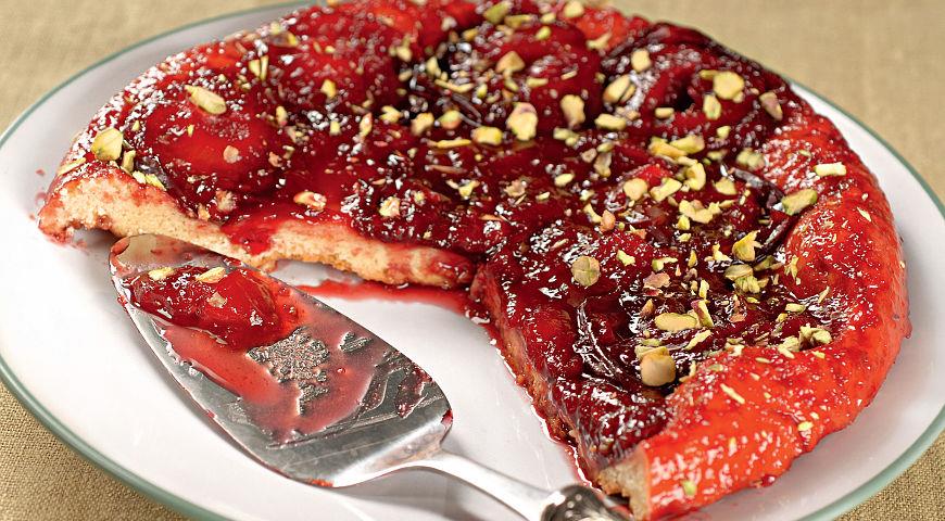 - Всыпать просеянную с разрыхлителем муку и молотый миндаль. Вымесить однородное тесто. Выложить его на сливы и разровнять поверхность. Выпекать пирог-перевертыш 40 мин при 180&dag;C. Дать постоять 10 мин, затем перевернуть на блюдо.
