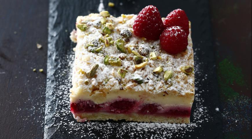 - Достаньте пирог с малиной и творогом из духовки и остудите на противне. Мелко порубите фисташки. Остывший пирог посыпьте сахарной пудрой, а затем фисташками. Нарежьте порционными кусочками.
