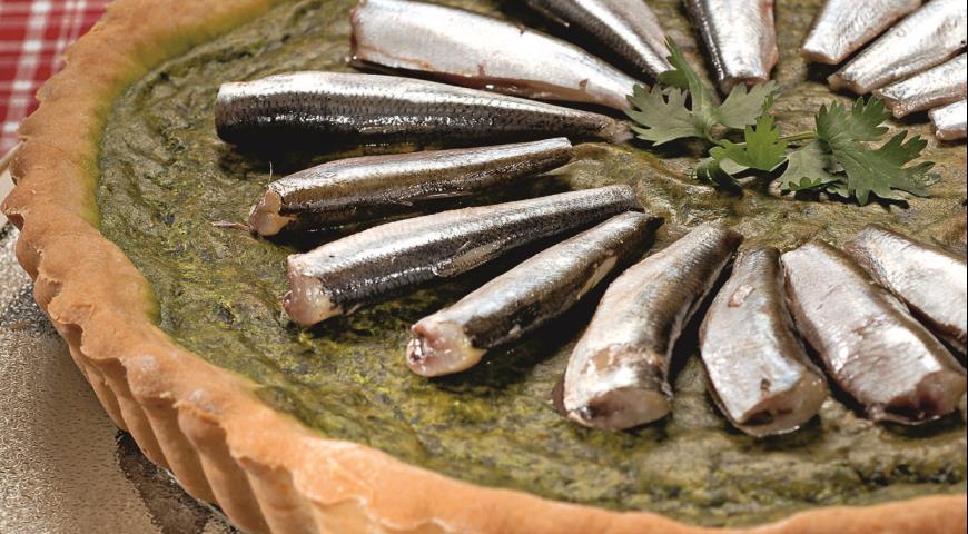 - С основы киша удалите бумагу с бобовыми. Вылейте на выпеченный корж начинку и поместите в духовку на 20 минут. Затем достаньте киш и уложите сверху оставшуюся кильку. Выпекайте еще 5 минут.