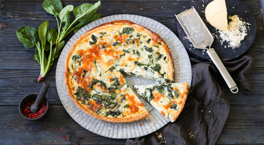 - На основу киша выложите шпинат и разровняйте. Залейте яично-молочной смесью и выпекайте около 30–40 минут при 200°C. Дайте немного остыть и подайте на стол.