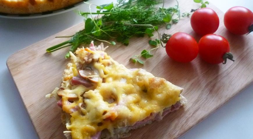 - Куриное филе посолить, поперчить и пожарить на сковороде-гриль (или обычной сковороде) до готовности. Нарезать кубиками. Ветчину нарезать соломкой, сыр натереть. Соединить курицу, ветчину, грибы, немного сливок. Начинку выложить в форму.