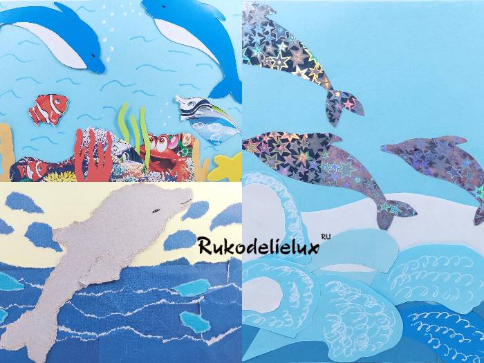 Аппликации дельфинов из бумаги: стайка, обрывная, в море — шаблоны для детей
