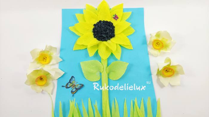 Аппликация подсолнуха из бумаги (цветной, креп-гофрированной) для детей