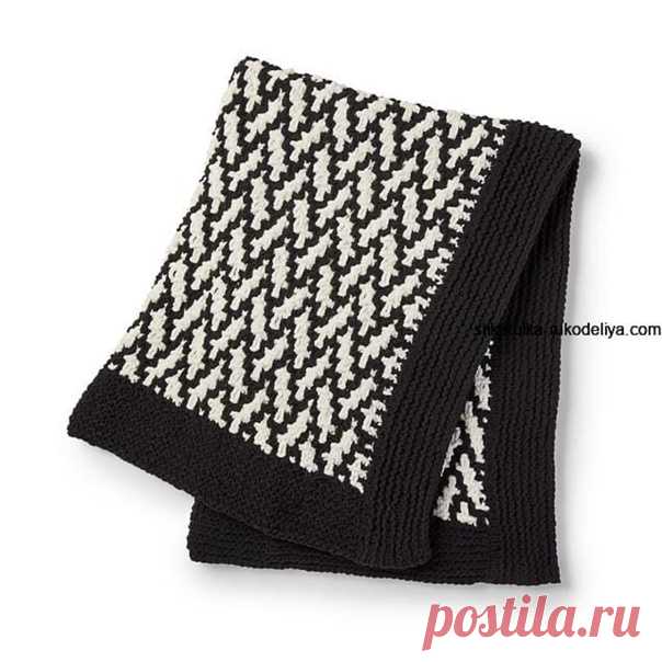 Вязаный плед MOSAIC HERRINGBONE. Простой ленивый жаккард для пледа Размер: 134х165 см Необходимые материалы: Пряжа Bernat Blanket (100% полиэстер; 200 м / 300 грамм в мотке) – 3 мотка черного цвета (нить А) и 2 мотка белого цвета (нить В). Необходимые инструменты: Круговые спицы № 8 и № 9 длиной 100 см. Плотность вязания: 8 петель и 20 рядов = 10 см рисунка «ёлочка», выполненного спицами № 9; 7 петель и 16 рядов = 10 см платочного рисунка, выполненного спицами № 8. Заме...