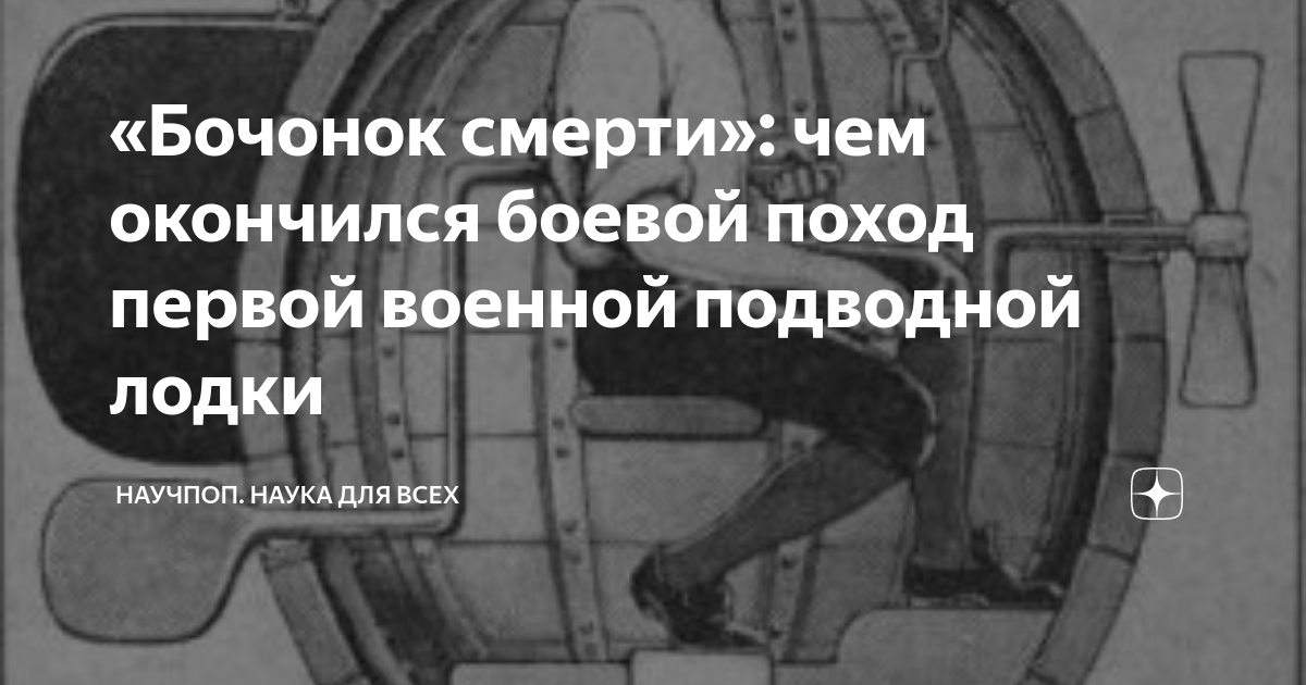 «Бочонок смерти»: чем окончился боевой поход первой военной подводной лодки Что не говори, но американцы действительно очень изобретательные ребята. Особенно, когда дело касается уничтожения себе подобных. 7 сентября 1776 г. неуклюжая, тихоходная субмарина «Черепаха» бесшумно приблизилась к английскому флагману адмирала Ричарда Хоу, пытаясь прикрепить к днищу корабля бомбу замедленного действия. Дело происходило в гавани Нью-Йорка, во время войны Северных Американских Шта...
