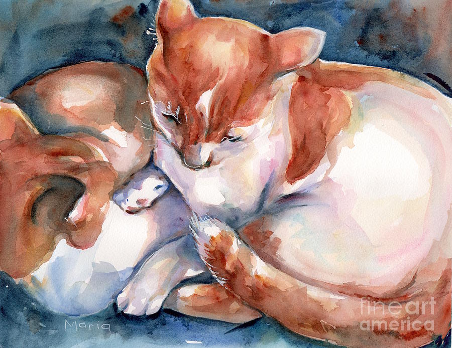 Cat watercolor two yellow and white cats by Maria Reichert Cat watercolor two yellow and white cats Painting by Maria Reichert