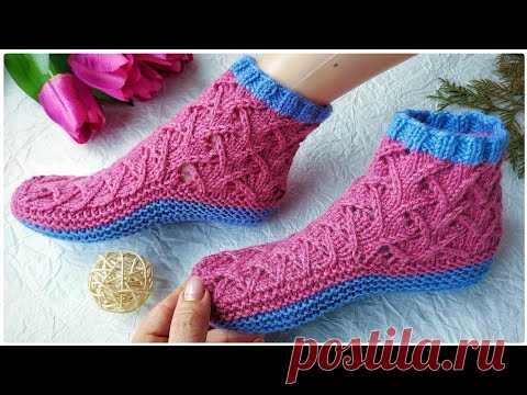 Домашние следки спицами. УЗОР "Елочка".Простые тапочки без швов на подошве.