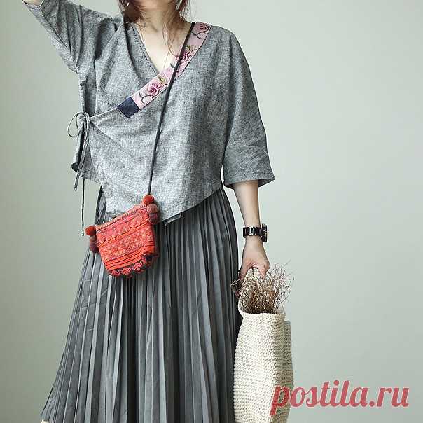 V-Neck Belted Linen Blouse Pink Floral Patchwork Gray Designer Blouse in Gray Black One Size - Morimiss.com